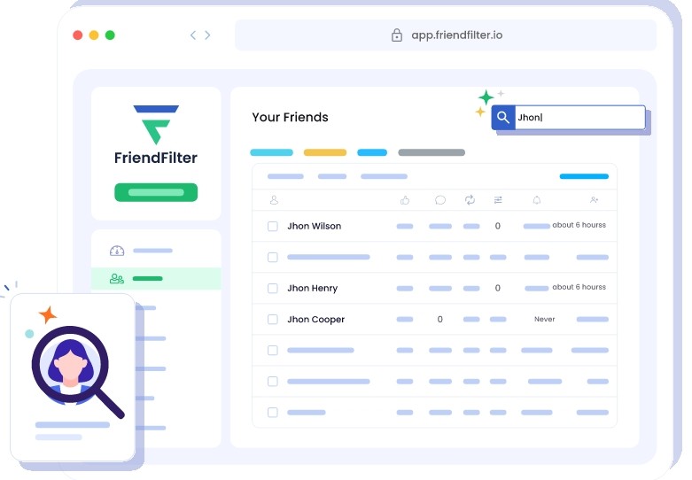 If you're wondering how to remove inactive friends from Facebook, FriendFilter is the solution. This intelligent Facebook friend rem bottle oper evaluates the interaction of your friend list, Empowers you to sift through, manage and remove friends who don't interact with you on fb. It is a privacy-first tool --no scraping, and no data misuse.